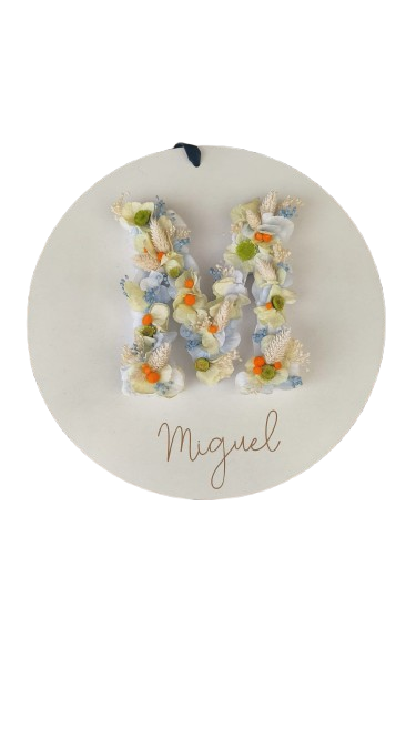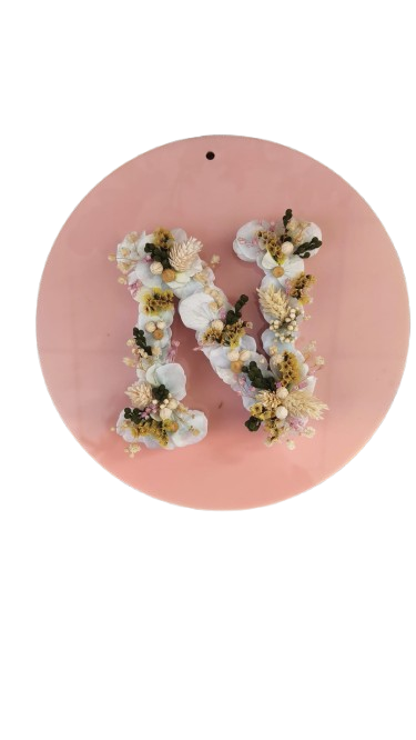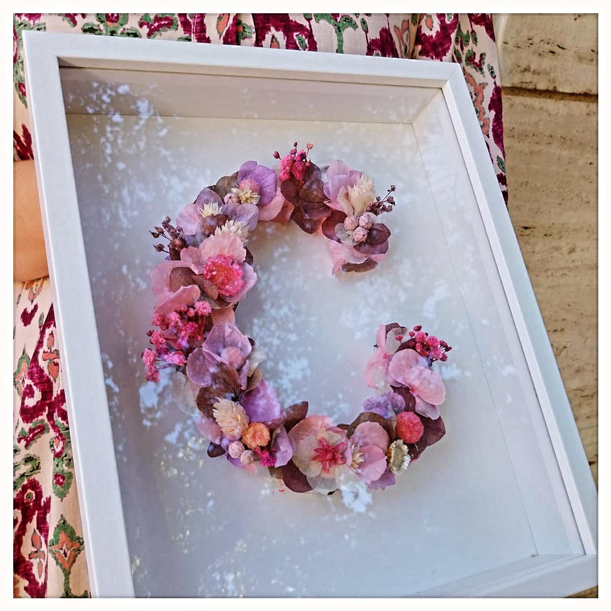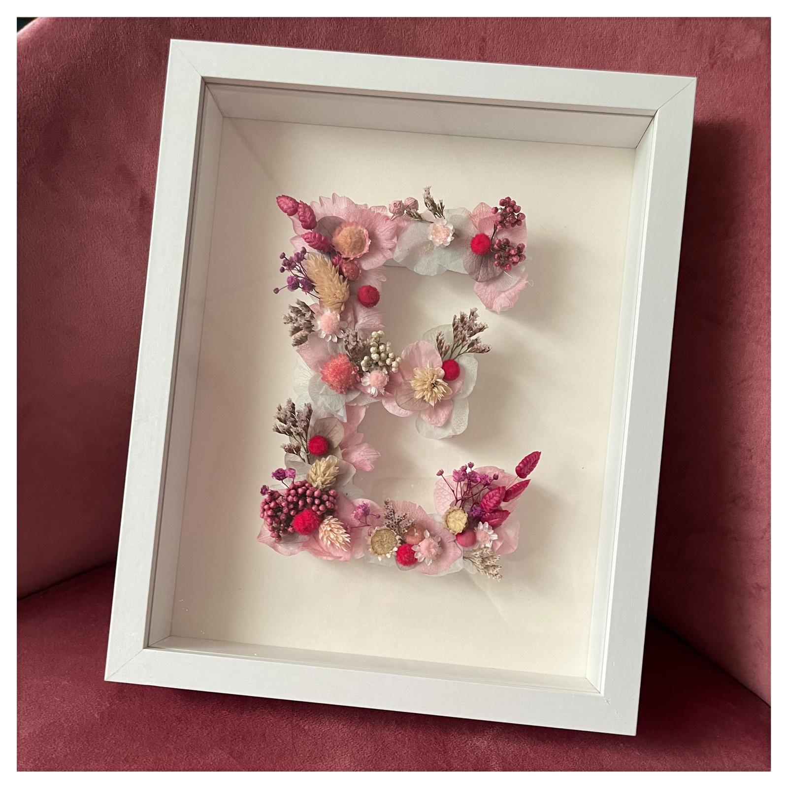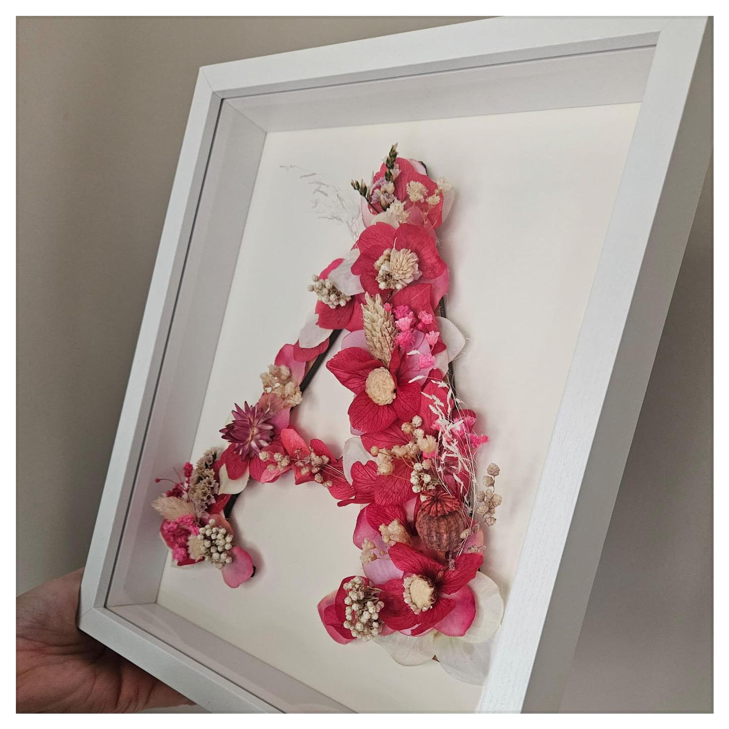 Letra creada con flores preservadas disponible en dos tamaños.
